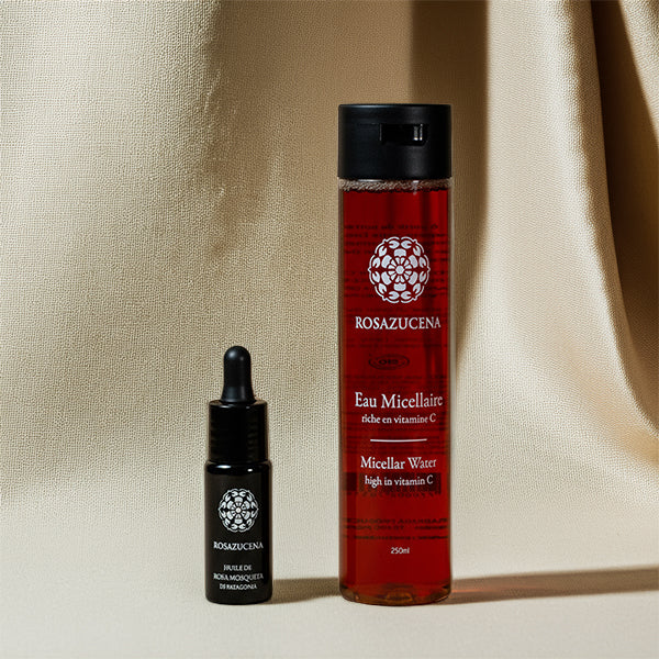 Le soir, on mélange quelques gouttes d’Huile Pure avec l’Eau Micellaire Rosazucena : une émulsion fine et délicatement parfumée qui dissout maquillage, impuretés et traces de fatigue sans jamais agresser. En un geste, la peau respire, apaisée et lumineuse.