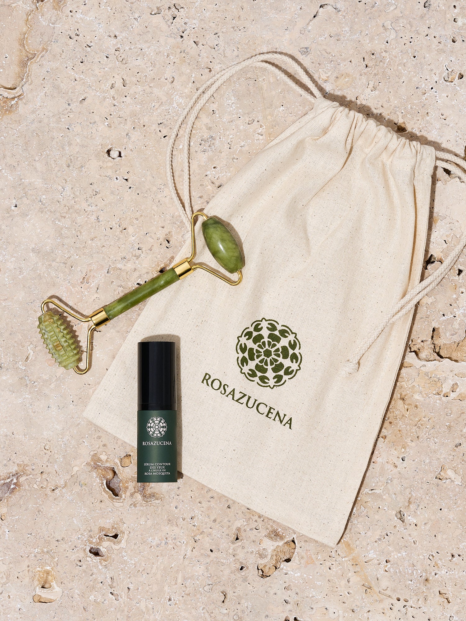 Le Sérum Contour des Yeux, formulé à partir d’extraits naturels et enrichi en Rosa Mosqueta, agit en synergie avec le Rollon Jade.