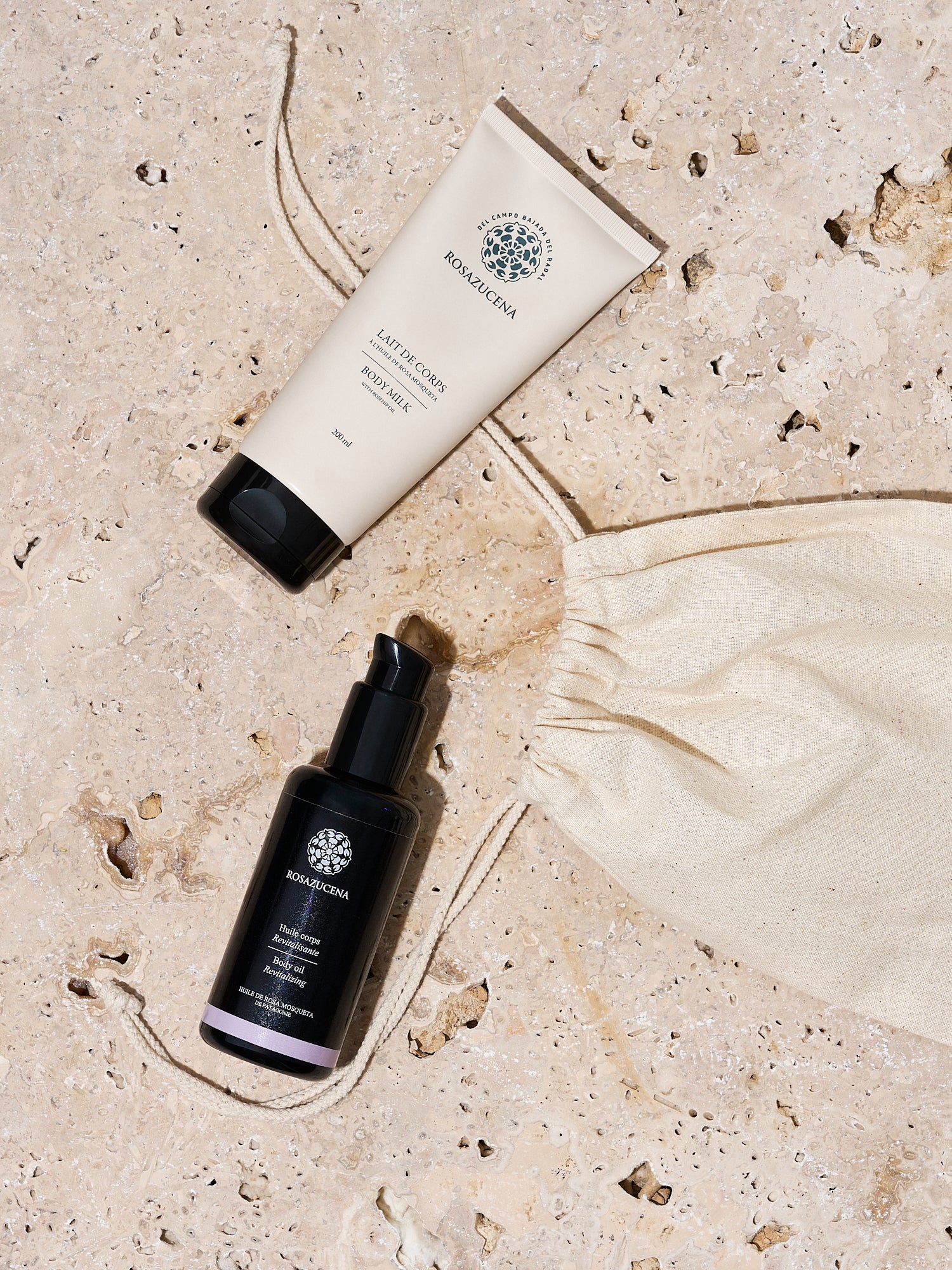 Le Lait Corps et l’Huile Corps enveloppent la peau d’un confort soyeux, portés par la Rosa Mosqueta et des huiles végétales naturelles.