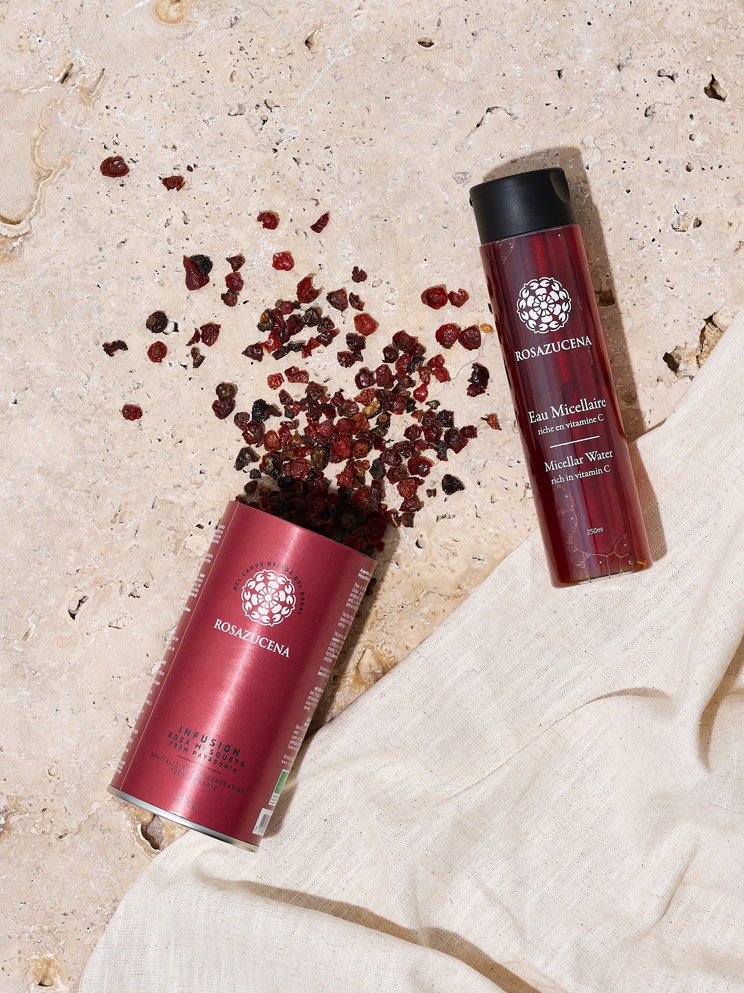 Ce coffret associe l’Eau Micellaire à la Rosa Mosqueta, qui nettoie en douceur et ravive l’éclat du teint, à la Tisane Rosa Mosqueta, riche en vitamine C naturelle — jusqu’à 50 fois plus concentrée qu’une orange.